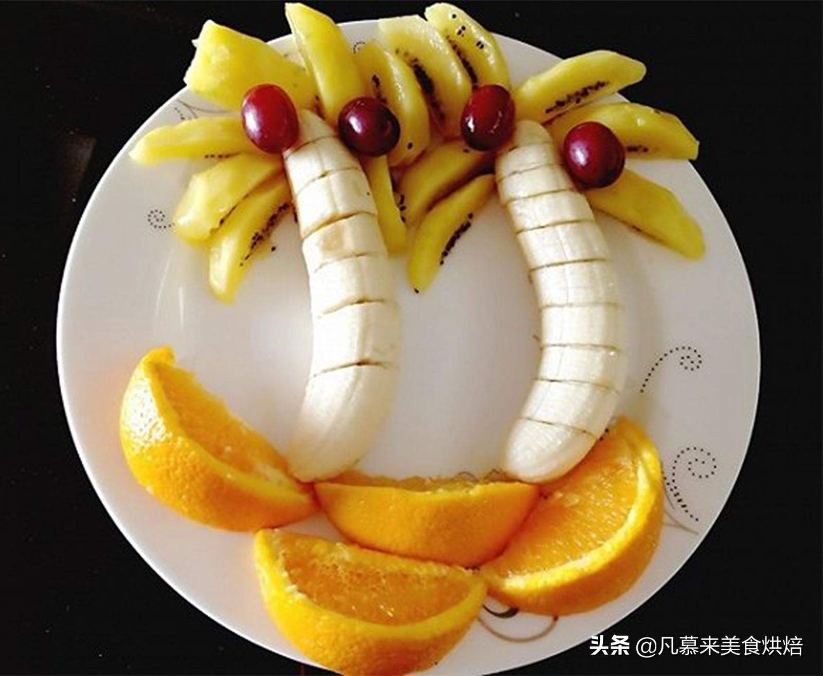 3、海岛风情:香蕉切段,作椰树干,猕猴桃切成椰树冠的样子,下面摆放几个橙子,一派海岛风情。
