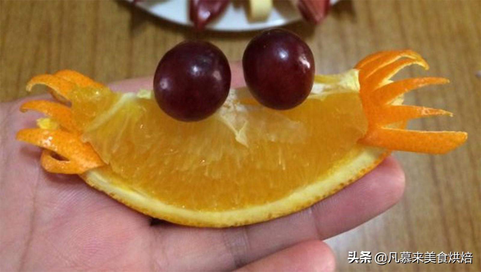 18、梭子蟹:橙子做的梭子蟹,两颗葡萄当做大大的眼睛,好可爱。
