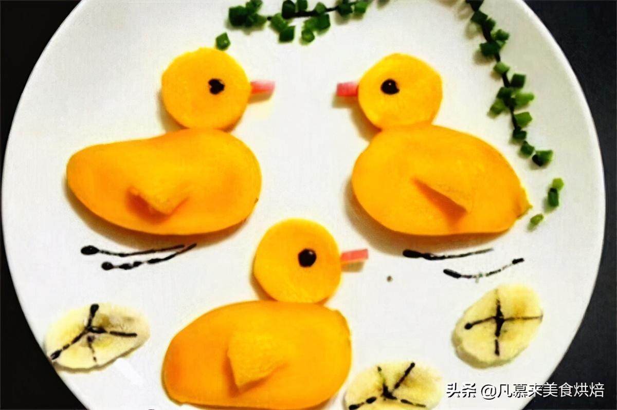7、小鸭子:芒果或者橙子,做成鸭子的造型,香蕉皮,猕猴桃丁衬托出湖中嬉戏的三只小鸭子。