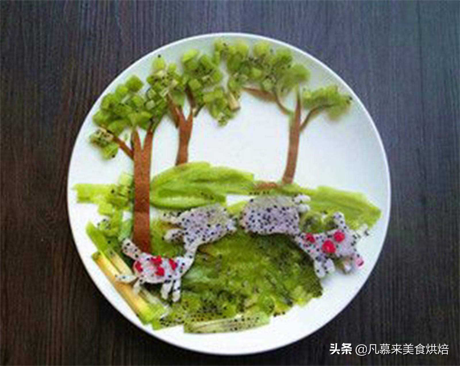 1、绿草悠悠小狗嬉戏:主材:猕猴桃、火龙果;树干直接用猕猴桃的外皮修剪出形状,绿色的猕猴桃做的绿色的草地、绿苔,树冠,火龙果雕刻成小狗的样子,郁郁葱葱的大树底下,绿草悠悠,两只小狗在下面嬉戏。