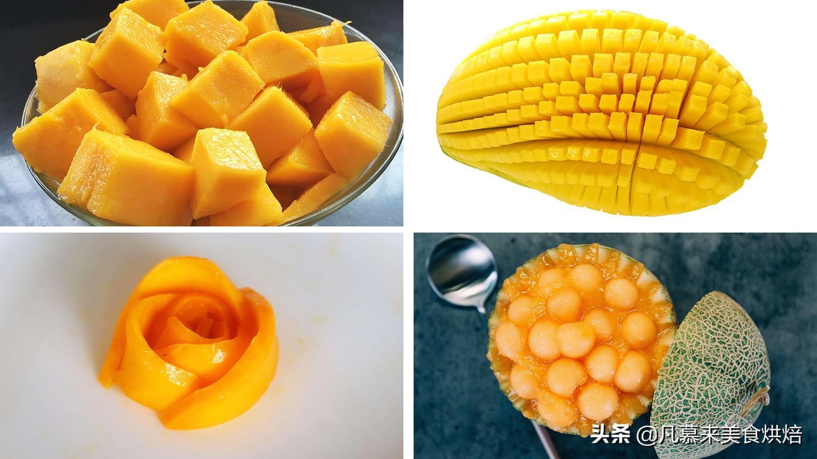 芒果一般切成丁、或者如右上角图上带皮切成十字花刀然后向外翻、切成片卷成花朵的样式、挖成球等。