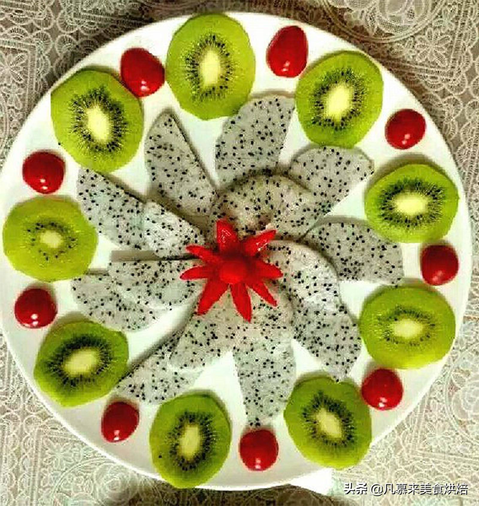 24、简约绽放:猕猴桃、火龙果、樱桃、摆成一朵绽开的花朵,简约而不简单,卓尔不凡。
