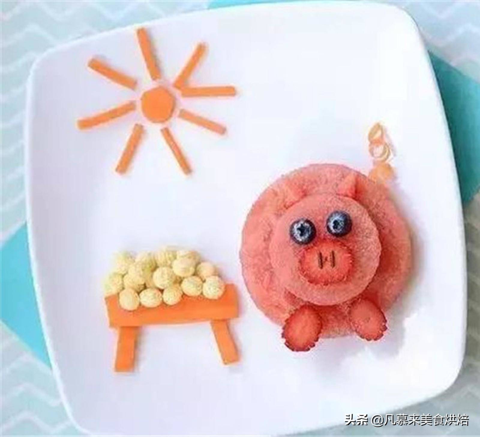 25、猪猪该起床了:西瓜做的猪猪造型、蓝莓当眼睛、胡萝卜雕刻成太阳、板凳,点缀上几个小点心,猪猪,太阳爬上山了,该起床了。