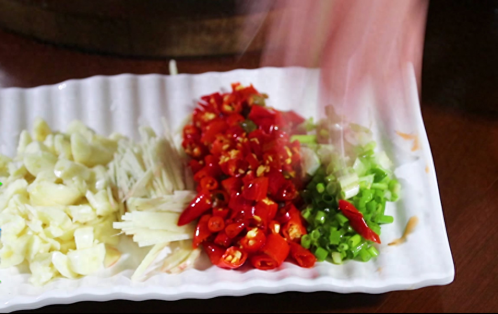 第二步:腌鱼的时间来切点配菜:大蒜瓣切碎,生姜切成丝,泡椒切圈,切点葱花。