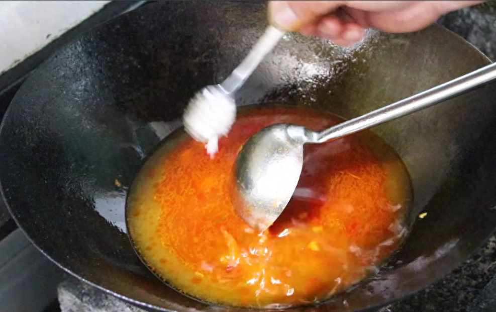 第六步:炒香后,加入清水,放适量的盐,放点点老抽,汤烧开后洒点胡椒粉。