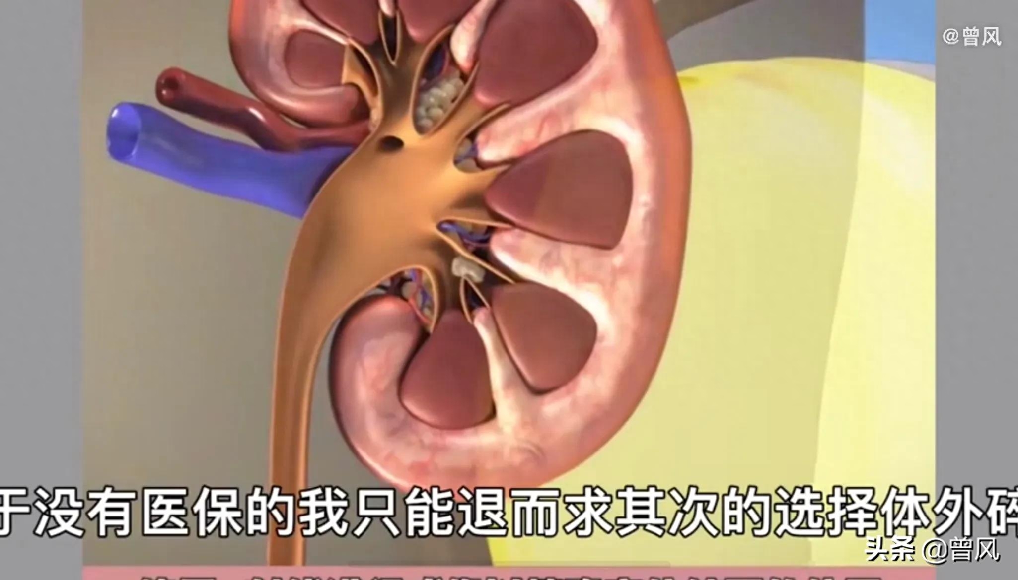 t当时想着先保命要紧,折腾半小时后毫无疑问,结果显示肾结石,两个肾都有,还不止一颗,医生说根除需要手术,对于没有医保的我只能退而求其次的选择体外碎石。