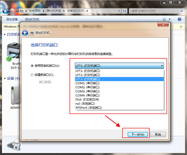 在这里需要选择打印机的端口,一般在打印机的机子上面会显示端口,或者在说明书上面也有说明,选择好对应的端口,就可以点击【下一步】。