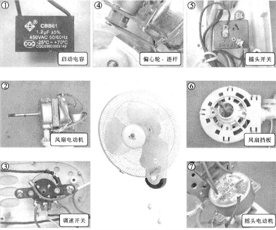 电风扇经常出现故障的部件有,启动电容,风速电动机,调速开关,摇头开关,摇头电动机,偏心轮,连杆,风扇挡板等损坏或变形造成的。部件如图2所示