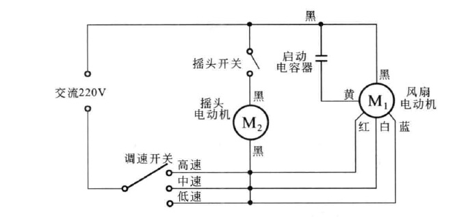 ②为风扇电动机,主要用来带动风叶旋转,损坏后会造成电风扇无法工作的故障。