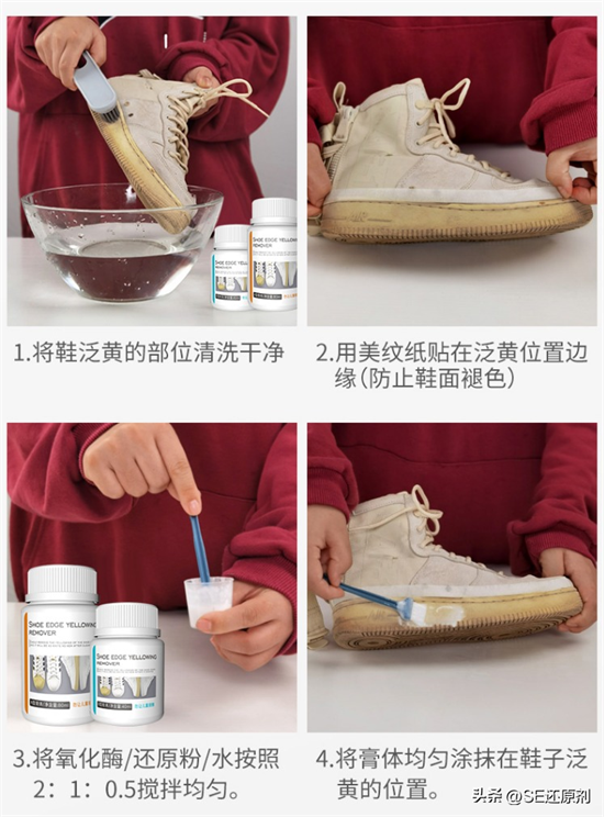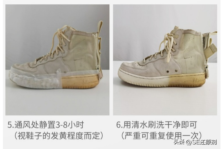 还有一个方法也是可以去除鞋边发黄的问题,不过这个可不是像牙膏一样家家户户都有点的,这是需要用到鞋边去黄剂。一听名字也就知道这玩意就是来去除鞋边发黄的问题。它还不是那种遮盖型涂白,将鞋边发黄的地方涂白遮盖而是通过氧化还原的方式来解决鞋边发黄的问题。在清洗的过程中对鞋子也是没有伤害的。用上它只需一晚就可以得到一双干净的鞋子。