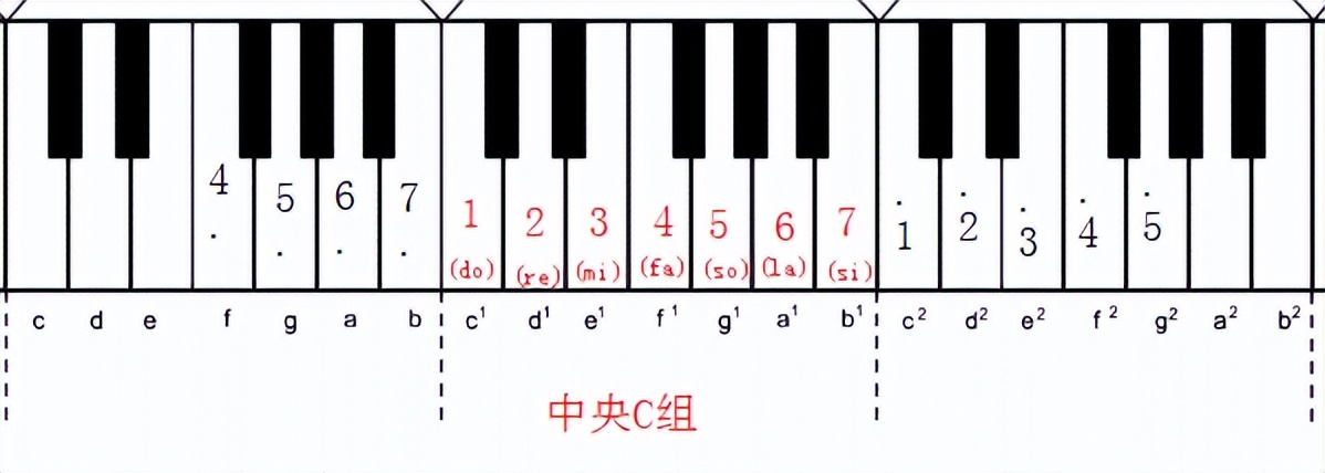每一组的白键从左往右数的唱名都是do(C)、re(D)、mi(E)、fa(F)、so(G)、la(A)、si(B),也就是1、2、3、4、5、6、7。
