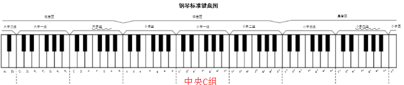 上图可知,我们把7个白键和5个黑键为一组,中间三组是中音区,左右两边分别是低音组和高音组,一共7组。黑键都是呈2个键排一起到3个键排一起,由此循环。所有2个黑键排一起的左边第一个白键就是do。最中间那一组的第一个白键的do称之为中央do,也称中央C。