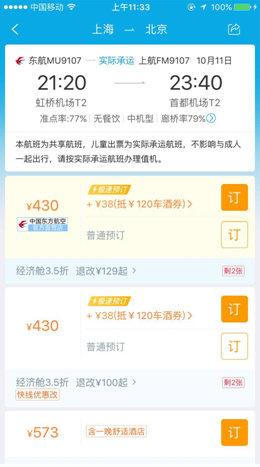 以10月11日东航MU9107上海飞往北京的航班为例,进入携程App机票预订页面,在折扣机票展示中,携程给予了消费者两种订票选项,一种是极速预订,另一种为普通预订。