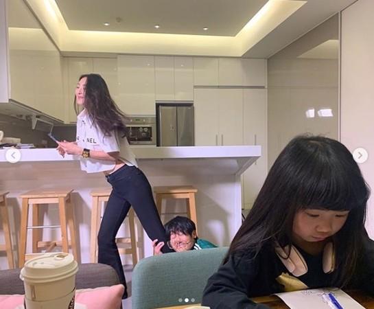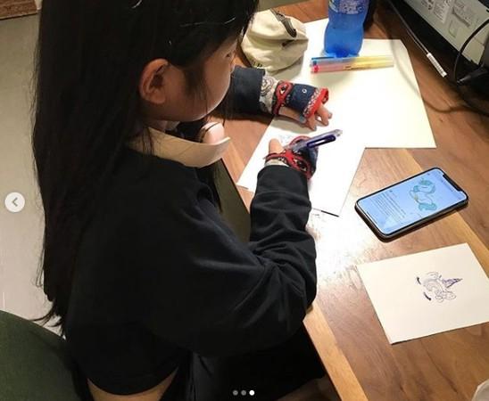 曹格跪在地上抱住老婆大腿,女儿Grace则不受影响专心画画