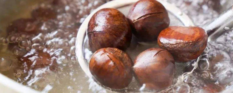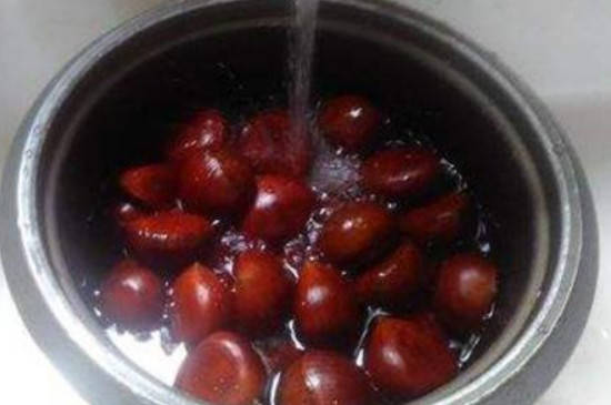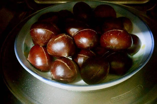 将板栗洗净放入容器里面后,往里面加入少量精盐,再吧开水倒入里面并盖上盖子焖5分钟。之后将其取出切开,栗子皮和壳就可以轻易被去除。