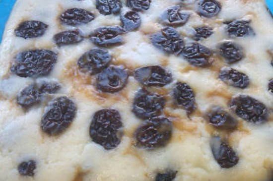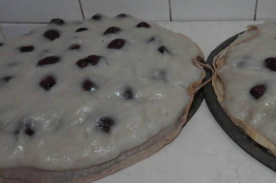 3、将面糊倒入容器内,再往面糊上面撒上熟芝麻和红枣。
