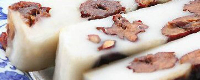 年糕糯米粉和粘米粉的比例是5:2,将糯米粉和粘米粉按比例混合调匀后,往里面加适量生粉、糖和水搅成面糊。再把面糊倒入容器内,往面糊上撒熟芝麻和红枣,最后放入蒸锅蒸制就可以食用。