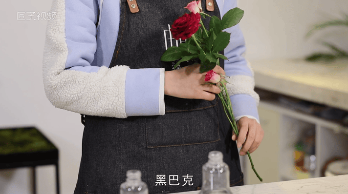 水、一把花枝剪、黑色铁丝、废弃的小灯泡或者瓶子、尤加利叶、黑巴克、狂欢泡泡、红色小菊花。
