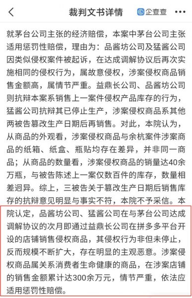 判决书显示,被告公司曾委托猛酱公司生产、销售与茅台酒包装高度近似产品。此前,原告茅台公司与侵权公司达成调解协议,次月被告侵权行为未停止并扩大规模,涉案店铺销售金额累计达300余万元。判决结果,被告公司停止不正当竞争并赔偿原告经济损失及合理开支共计100万元。