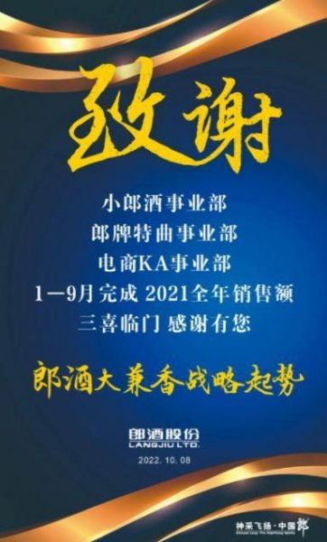 上月,郎酒召开“郎牌特曲事业部旺季大会战动员会”,数百名经销商线上参与的大会中,郎酒宣布“郎酒销售公司1-9月达成预定目标。其中,郎牌特曲事业部、小郎酒事业部、电商KA事业部完成去年全年回款、出货指标。”