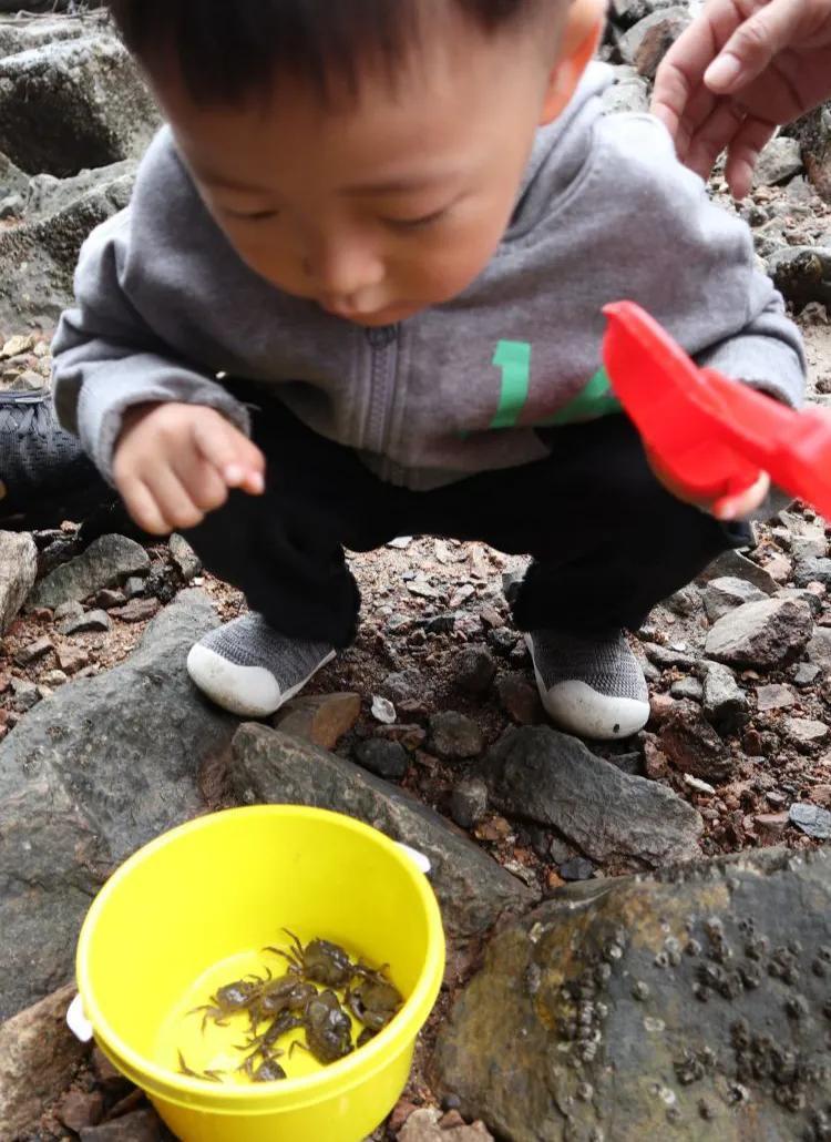 捉小螃蟹是海边赶海的重头戏,孩子们赶海最主要的玩乐对象就是可爱的小螃蟹。翻开一块石头,发现一只小螃蟹迅速逃跑,小孩子们都会兴奋地去追,抓住后会兴高采烈地放入小瓶子里,开心得合不拢嘴。