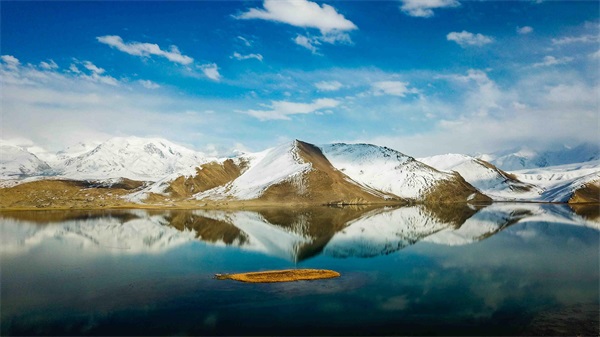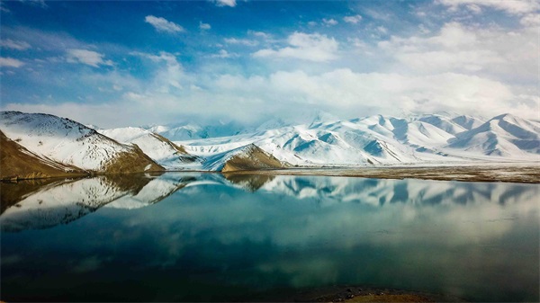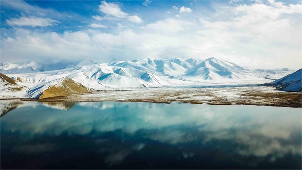 这里清澈洁净的湖水与洁白的雪山交相辉映,看起来如梦如幻。波光粼粼的湖面上还倒映着蓝天白云、高山冰川的影子,好不美丽。