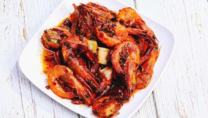 4、再加入小辣椒与一勺糖,翻炒几下,待蒜香四溢,将虾倒入锅内,大火翻炒均匀。