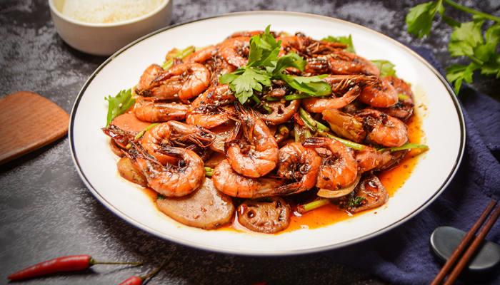 5、虾翻炒至变色后,倒入适量酱油,少许盐,再翻炒至均匀。