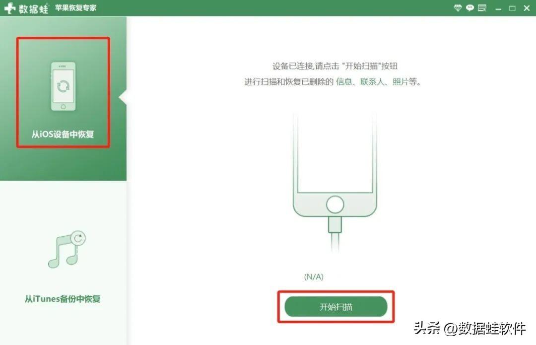 我们选择第一个【从iOS设备中恢复】即可,然后点击【开始扫描】按钮,进行扫描和恢复已删除的微信聊天记录。