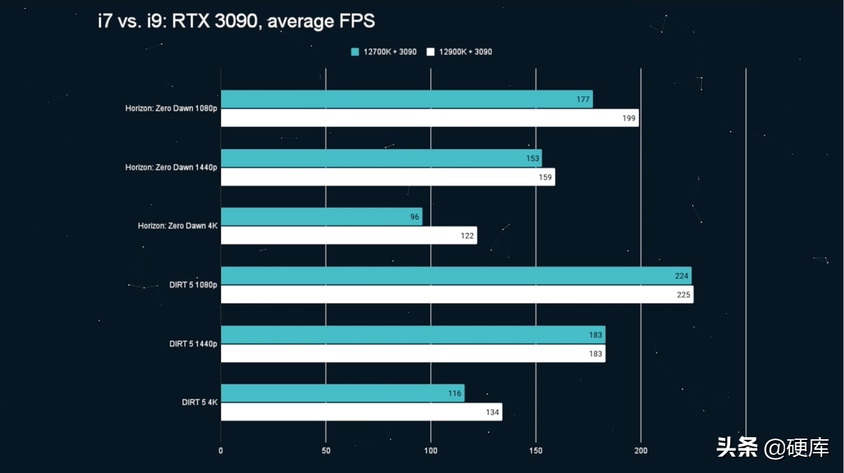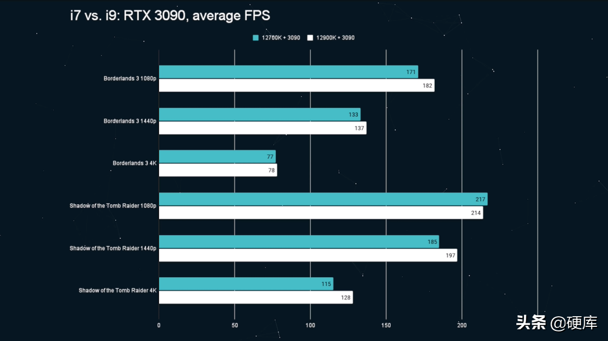 在搭配RTX3090的情况下,在地平线零之曙光、尘埃5、无主之地3和古墓丽影:暗影4款游戏中,1080P分辨率情况下,i9 12900k和i7 12700k差别很小,性能差距只有4%,比生产力的差距更小。