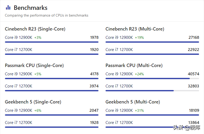 总的来说,参数的区别并不多,但这些区别很实在。i9 12900k在核心数、线程数,单核睿频、全核睿频相比于i7 12700k都有提升。在三款跑分软件CinebenchR23、Passmark CPU和Geekbench 5中,虽然单核跑分差距并不明显,但多核跑分却有20%、30%不等的差距。从这种多核能力的差距,我们也能看出i9 12900k的主要提升是多任务能力,更偏向于生产力使用场景。那么在实际使用场景中会有多少性能差距呢,让我们来看一下生产力对比表现和游戏测试对比差距。