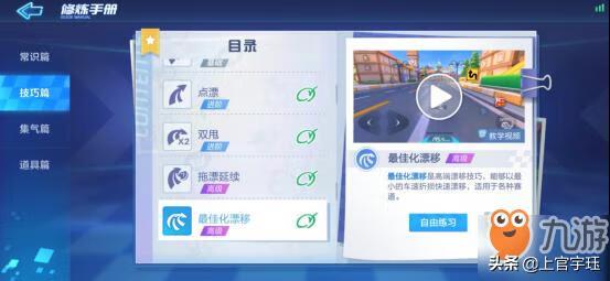 大多数新手是这样的,每次漂移结束后都习惯性按一下上,然后就喷火了,但这是如果你在按上的同时,按下别的方向键,效果就不同了,你会发现车身立刻偏了一个角度,我觉得大约是15到30度,这项技能在实战中很常用,因为被别人撞,或者有失误时可以很坏调整车身方向。在自由训练模式中,对刚刚学会的“最佳化漂移”技巧进一步的巩固,除此,还可以选择对“最佳化漂移”技巧进行单独训练哦,多加训练能提升