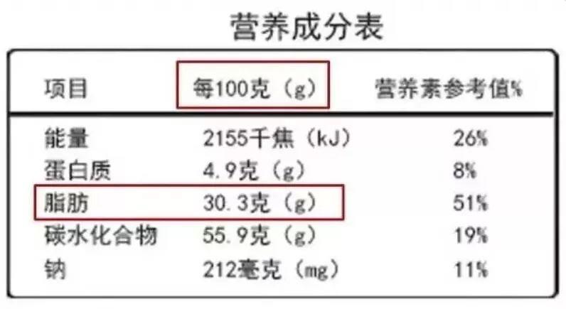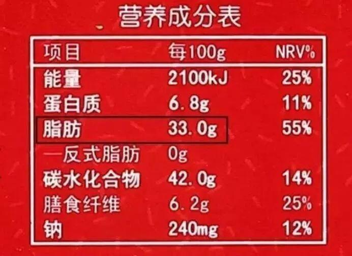 这是某粗粮饼干的营养成分表,100克里就有33克的脂肪。