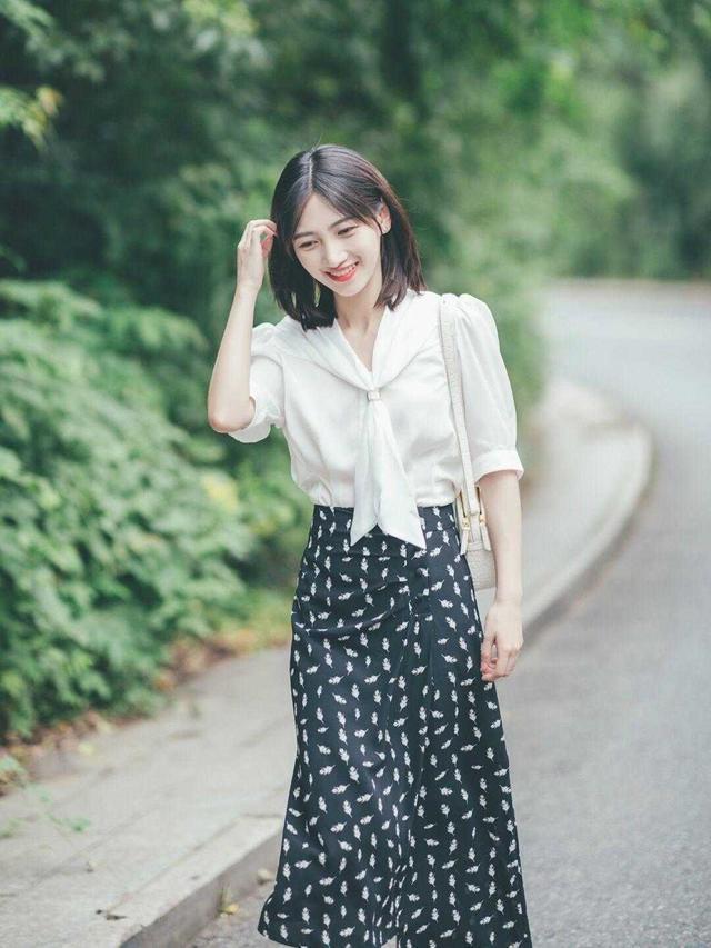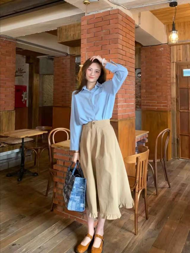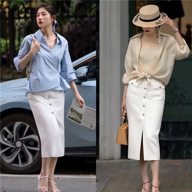 衬衫和半身裙的搭配很优雅,裙子尽量选择长款的裙子,长款的裙子更容易衬托出自己IDE气质,达到优雅高级的视觉效果,很有自己的特点。