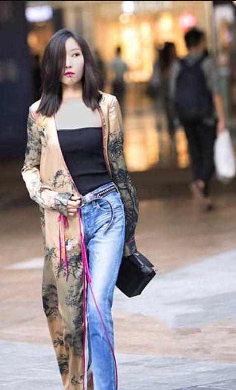 小姐姐身穿黑色抹胸打底,搭配紧身牛仔长裤,散发年轻气息!【上海街拍:美女身材丰腴,身穿粉色上衣,内衣微露,女人味十足!】