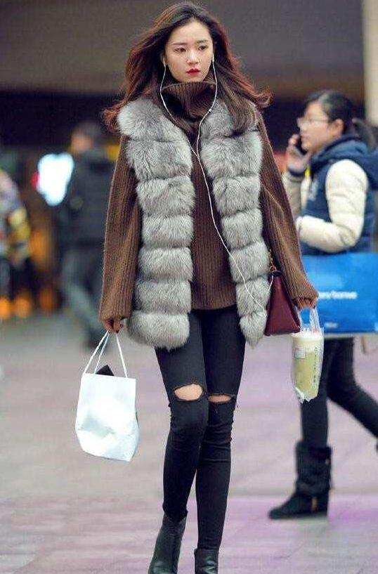 小姐姐身穿时尚皮草搭配黑色破洞裤子,身材苗条特别好看!