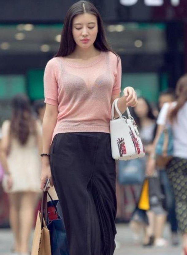 美女简约时尚的穿搭,优雅知性,尽显曼妙身姿!【上海街拍:美女身材丰腴,身穿粉色上衣,内衣微露,女人味十足!】