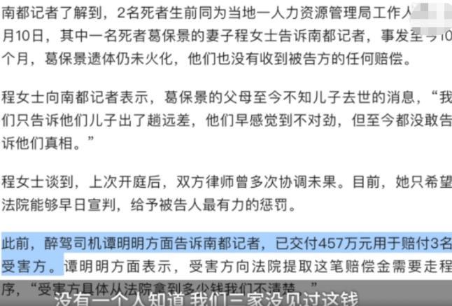一开始谭明明家属表示愿意支付457万赔偿金,但让人意外的是,受害者家属均表示并没有收到赔偿金。