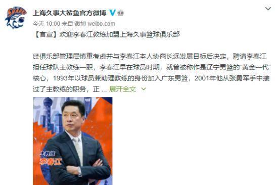 李春江执教获官宣,“上腿”上到上海滩,大鲨鱼或从此露出利齿