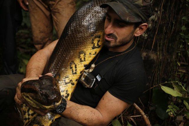 在国外,保罗就凭一己之力,挑衅一条长7米的绿水蚺,来体验人体被吞噬的感觉。