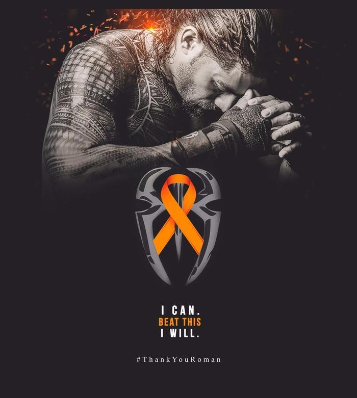 “我能打败它,我一定会的。”这是罗曼的真爱粉给罗曼制作的精美的海报,在罗曼标志的中央系上了一个橘黄色的代表关爱白血病的丝带,象征着罗曼现在正在跟白血病战斗。