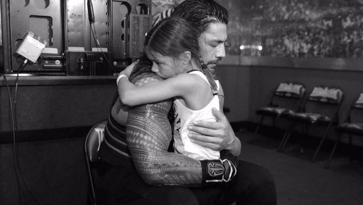 “爸爸,他们为什么讨厌你呢?”这张照片摄于2015年摔角狂热之后。在那次比赛中,罗曼在与莱斯纳的WWE冠军赛中遭受了铺天盖地的嘘声,最终因赛斯·罗林斯兑现公文包而输掉比赛。赛后罗曼回到后台,与等候多时的女儿拥抱。
