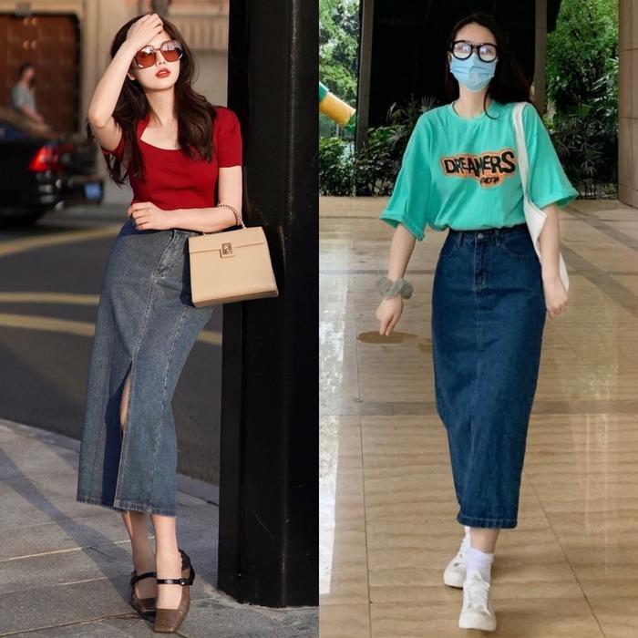 在此基础上,建议身材苗条的女性试一试直筒牛仔半身裙的搭配,这样的款式裁剪得当,可以利用笔直的线条修饰身形,让下半身的线条得到一定程度的延伸,放大身材优点。下图博主的穿搭就能显得整个人十分苗条显瘦,显身材的同时也能凸显整个人的气质感,方便从人群中脱颖而出。