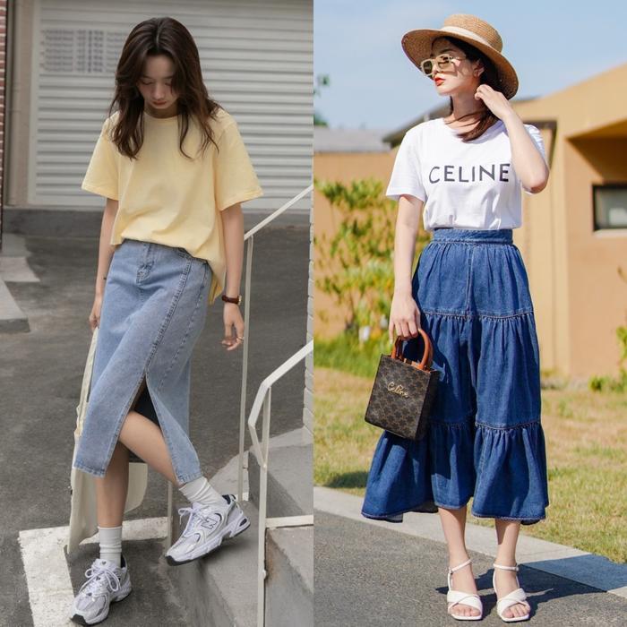 在夏季的牛仔半身裙的搭配上,大家可以试一试这样一套搭配模板,将T恤+牛仔半身裙搭配在一起可以让穿搭看起来既清爽又日常。