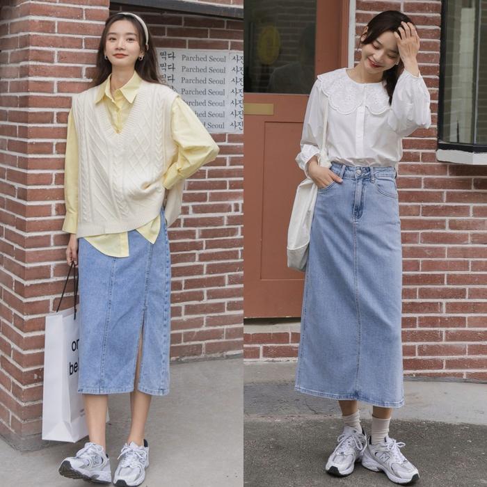 除此之外,女性朋友们也可以选择一款开叉设计的半身裙进行搭配,这样的半身裙款式可以显得整体搭配更有亮点。下图博主的搭配虽然将基础的白上衣+浅蓝色牛仔裙套用在了一起,却能穿出十分高级耐看的效果,这主要是由于开叉设计打造出了大腿部的露肤感,让层次和细节有所凸显达成的结果。
