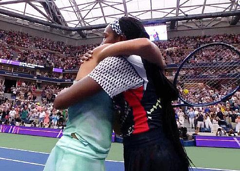 最后来猜一猜认一认。下面这张图片是两位球员赛后拥抱。不作提示,您能认出她们俩是谁吗?