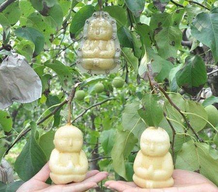 这种像人形一样的人参果是用模具套在生长着的梨或者瓜类水果上成长而成的,摆放着看上去很漂亮,观赏价值远远大于实用价值,要比普通人参果价格高很多,其实真正的人参果不是这样的。