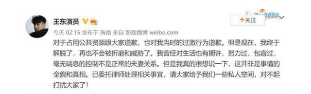 王东在今天凌晨发文,对于占用公共资源跟大家道歉,也对我当时的过激行为道歉。但是现在,我终于解脱了,再也不会被折磨和威胁了。