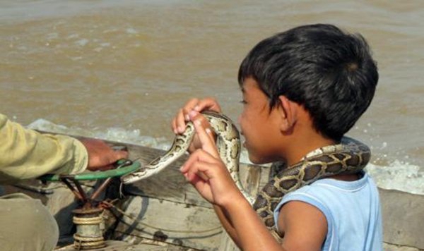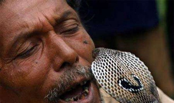 印度人不妨说是大众都敢耍蛇玩,他们从很小的时间便跟蛇一齐游玩,许多儿童子也能白手抓起几米的眼镜蛇,女人们也是没在怕的,实足把蛇当成了宠物,常常抱起蛇便亲上了,手上也常常会纠葛着一二条蛇把玩,以至有人将蛇纠葛在身上,大摇大晃的走在街上,好像在夸耀本人有多果敢无畏。