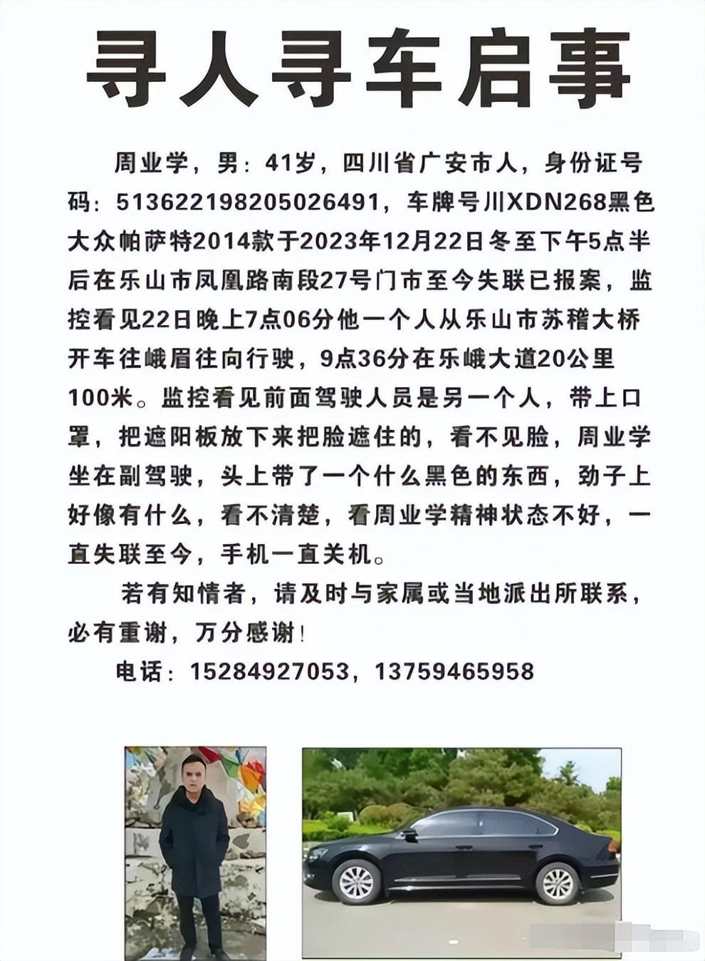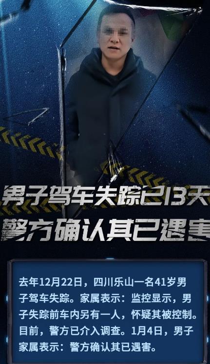 2024年1月4日,四川乐山已失踪13天的男子尸体及驾驶的车辆被警方找到。